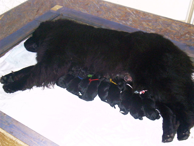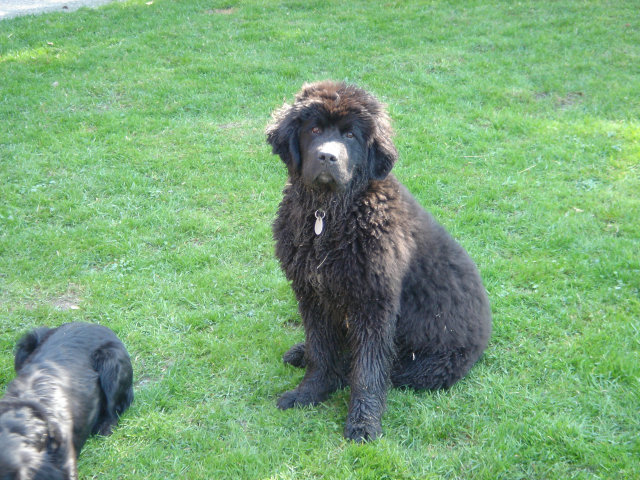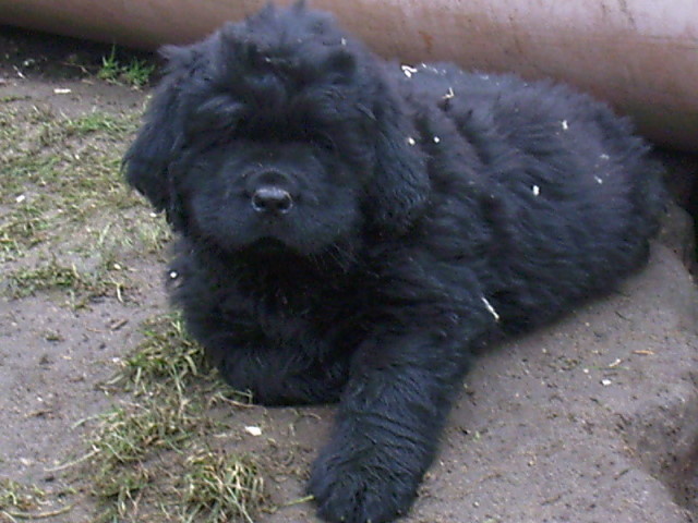 Nun, die Größe der Mutter lies keinen Zweifel, was aus diesen süssen, hopsenden Strubbeltieren mal werden würde, aber so war es ja auch geplant. Und schließlich waren diese Teddybären gerade mal 6 Wochen alt. Unsere Wahl fiel auf ein flauschiges Mädchen, das etwas verträumt und über und über mit Sägespäne bedeckt auf einem kleinen Kasten lag und uns mit braunen Knopfaugen beobachtete. Sie hatte lediglich einen kleinen, weißen Fleck auf der Brust und schien zu sagen: Ein Bauernhof mit sieben Kindern und ein paar Dutzend Viechern ist für mich kein Problem. Nun mussten wir uns lange, lange, lange gedulden, bis das neue Familienmitglied dann auch zu uns kommen durfte. Im Alter von 12 Wochen war es dann endlich soweit, ausgerüstet mit Hundedecke, dem dazugehörigen Kleingeld und einer riesigen Portion Enthusiasmus bereisten wir abermals den Züchter, um unseren ‚Neufi’ abzuholen. Unser Welpe gehörte zu einem G-Wurf , bei dem nun alle Sprößlinge einen Namen mit G bekommen mussten. Unser ausgewähltes Modell tapste fortan tolpatschig als „Gypsy-Queen vom Mühlrad“ durch den Zwinger. Aber trotz der Aussicht auf etliche Zentimeter zu erwartender Körpergröße schien uns der Name „Zigeuner-Königin“ nicht so recht zu passen. Wir nannten unser Zuckerstück „Thula“, warum auch immer. Der Name klang einfach gut, war kurz und zackig zu rufen und klang ein bißchen nach „ganz weit weg“, Neufundland lag ja auch nicht gerade um die Ecke. Als wir im Januar dann unsere