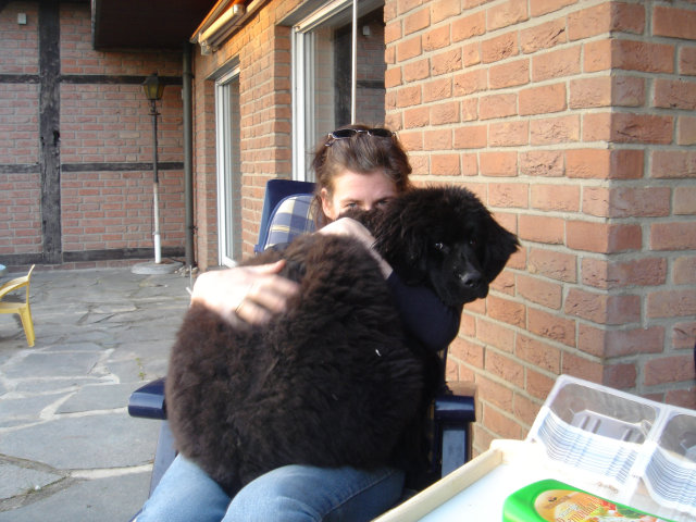 Nun zugegeben, das ist etwas übertrieben, aber zwanzig Jahre waren es wirklich. Was das überhaupt ist, ein „Neufundländer“? Also Hardy, mein Jüngster, meint, es müsste „Neunpfundländer“ heissen, weil unser Welpe, den er mit abholen durfte, schon schwerer war als sein Schulranzen. Das ist jetzt eineinhalb Jahre her, in denen sich unser Leben mit einem „Neufundländer“ sehr verändert hat. Aber ich will von Anfang an berichten. Wie gesagt, der Wusch nach einem solchen Tier schwelte in meinem Herzen schon lange. Da wir in den letzten Jahren um die 80 Tiere auf unserem Bauernhof versammelt hatten, von Eseln über Schweine, Ziegen, Schafe, war es eine bunte Mischung, sogar ein Pfauen-pärchen war mal dabei, sah ich die Zeit gekommen, den Traum von einem „Neufi“ zu verwirklichen. Der Kostenfaktor im Gegensatz zu unserern Hoftieren war nicht ganz unerheblich, schließlich handelte es sich ja um einen ‚Rassehund’ und gerade bei den Grosshunden sollte man doch sehr auf die Gesundheit achten, damit es im fort-geschrittenen Alter nicht zu Problemen kommt. Grosshund?
